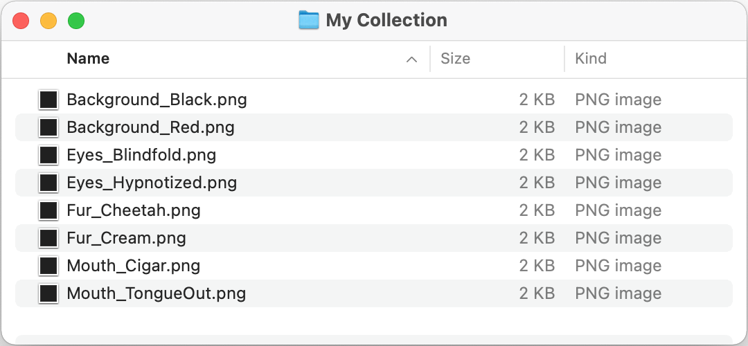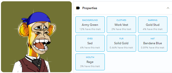 Layer names are added to the NFT Metadata and displayed on exchanges like OpenSea. Each layer then has a certain number of unique traits, which are more specific, and each unique trait would appear a certain number of times in the NFT collection.